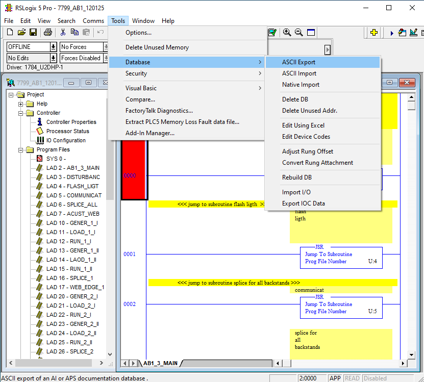 Open the RS Logix 5 Software and Select ToolsDatabaseASCII Export